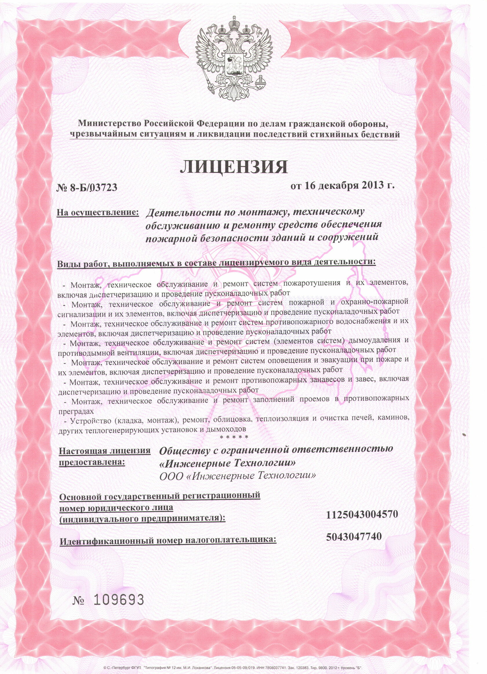 Компания ООО «Инженерные Технологии» имеет Лицензию МЧС на осуществление деятельности по монтажу, техническому обслуживанию и ремонту средств обеспечения пожарной безопасности зданий и сооружений.
